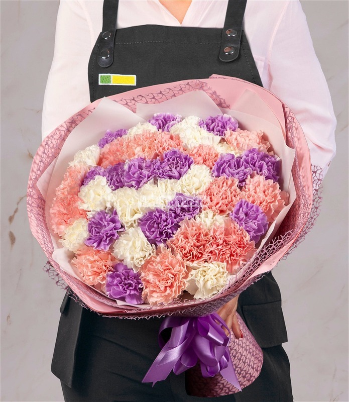 Состав: Лента натуральная (4), Гвоздика лиловая (17), Гвоздика розовая (17), Гвоздика белая (17), Пленка матовая (3), Крошет (3)
