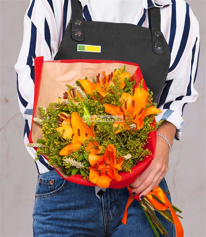 Состав: Солидаго (4), Лента натуральная (5), Фисташка (5), Тритикум (10), Бумага упаковочная (3), Лилия азиатская оранжевая (3), Упаковка Джут (3)